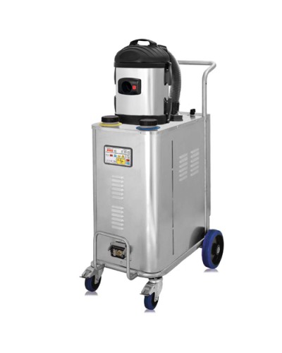 Generatore di vapore trifase per utilizzo nel settore industriale, con carrozzeria in acciaio inox (grado di protezione IPX5), autonomia di vapore illimitata grazie al sistema di ricarica automatica dell’acqua con serbatoio interno (sistema di controllo elettromeccanico livello acqua in caldaia - True Temp™) o tramite attacco diretto alla rete idrica. Possibilità di poter erogare detergente o acqua surriscaldata unitamente al vapore. Dotato di un aspirapolvere/aspiraliquidi con funzionamento a galleggiante. Sul pannello frontale del generatore è presente una consolle elettronica di comando costituita da un timer, un termometro, un manometro; un display digitale avvisa l’operatore quando è necessario effettuare la manutenzione della caldaia.
